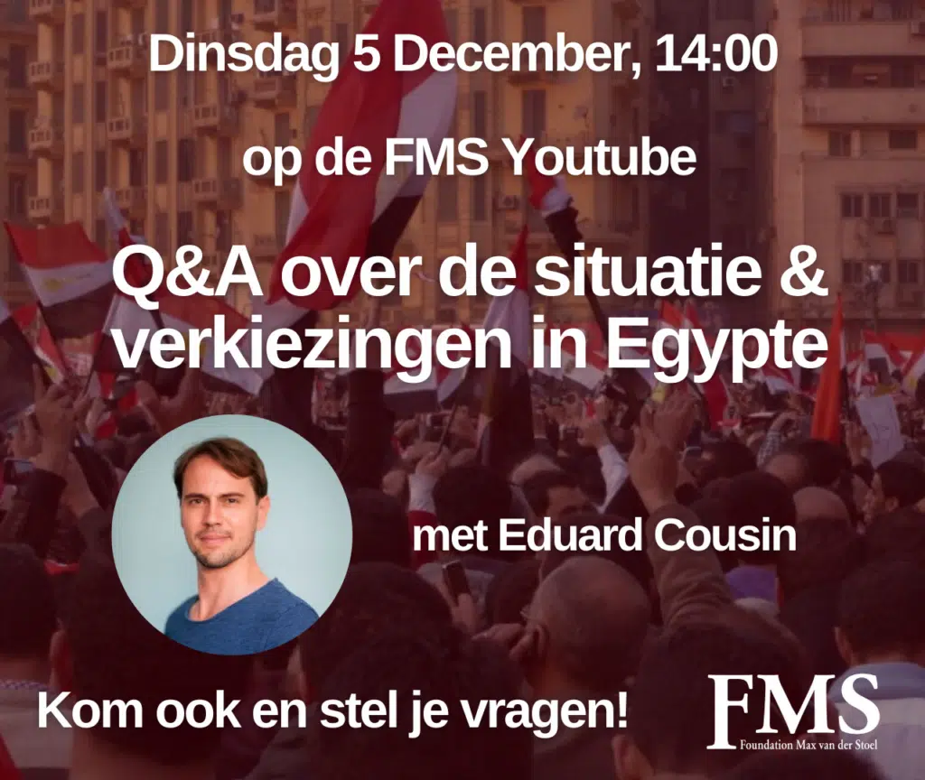 On Tuesday 5 December, at 14:00, writer and journalist Eduard Cousin will be our guest at the FMS to answer questions about the political situation in Egypt! Presidential elections are coming up in the country (10-12 December), in addition the country is also in the spotlight because of the war between Israel and Hamas.
